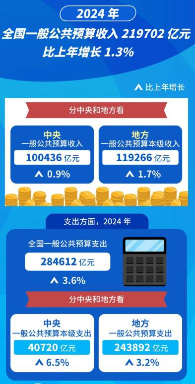 第一个“蓄水池”是一般公共预算,这是国家最常用的“钱袋子”,2024年总收入21.97万亿元,同比增长1.3%。